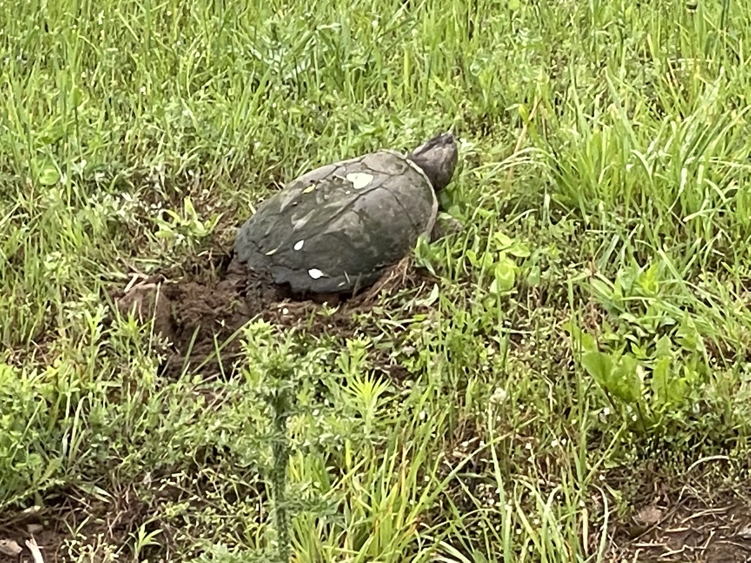 Raccoons know that song because they always come out grinning (those mischievous bandits!). Authority does not always win. For three days this week, snapping turtles have climbed from the river to the street to bury their eggs in sandy ground, usually on the shoulders of the street. Every year after the eggs are buried, raccoons dig them out of the ground for a midnight feast. Since these turtles are an endangered species, the Rideau Lakes Conservation Authority takes quick action to protect the sites where eggs have been lain.